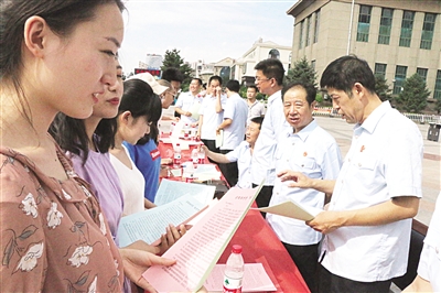 近日,张家口市法院系统300多名执行干警走上街头,在各自辖区繁华地段同时开展了集中执行宣传活动。活动中,广大干警主要围绕执行不能、最高人民法院“十个严禁”、省法院“八个不准”、“致申请人的一封信”、“给被执行人的一封信”、“给申请人的十个温馨提示”等相关内容进行了重点宣传,现场发放宣传单2万余份。此外,22名人大代表也参与此次宣传活动,在社会上引起较大反响,为“精准执行”攻坚战的顺利进行提供了有力的支撑。图为执行干警向群众释法的情景。