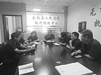 近日,无极县人民法院党组书记、院长武月江,党组成员、执行局长王翠满及全体执行干警在认真收看了全国法院执行局长第三次例会(视频)后,对该院执行攻坚工作进行了再安排、再部署。武月江要求执行干警一定要统一认识、查缺补漏、明确目标,坚决把执行各项工作做实做细、提质增效。 周海娟 摄