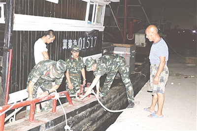 根据今年第10号台风“安比”运行动态和可能给秦皇岛沿海地区带来强风暴雨的情况,7月23日傍晚,秦皇岛边防支队沟渠寨边防派出所组织官兵深入辖区,开展防抗台风安全风险隐患“再排查,再防范”活动。图为官兵们正在帮助渔民加固渔船。