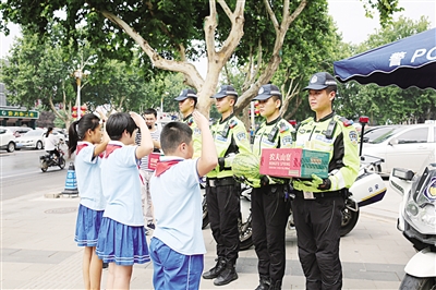 小学师生为酷暑中坚守岗位的交警送去防暑慰问品