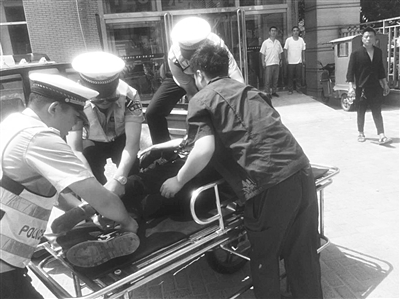 7月21日上午,在沧州市区解放东路,一辆由西向东行驶的三轮车与顺行的电动自行车发生碰撞,致使电动自行车骑车人摔倒在地,脚踝部位受伤,鲜血直流。紧急时刻,沧州市公安交警二大队四中队执勤民警用警车仅用两分钟将伤者送往市医院救治。由于交警送医及时,伤者的伤势得到控制。图为民警在帮着送医。