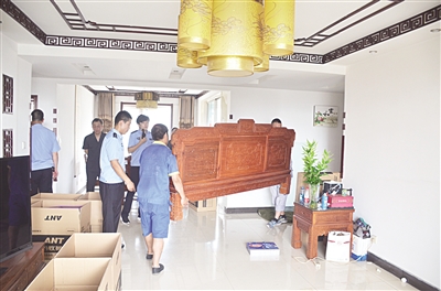 原告金源建筑劳务有限公司与被告王某、石家庄某建设集团有限公司、邢台某房地产开发有限公司建设施工合同纠纷一案,石家庄市新华区人民法院于2013年7月6日作出判决:被告方支付原告工程款68万元及利息。被告方拒不履行法院判决。法院依法将被告王某名下一套房产拍卖,但王某拒绝腾房。法院在强制执行过程中,遭到被执行人王某及家人、亲属的百般阻挠。7月30日上午,新华区法院执行局再次全体出动,执行干警强制将被执行人带离现场。经过近9个小时的强制执行,最终将房屋腾清并交付竞买人。图为在公安民警和被执行人同事见证下,执行人员搬运被执行人家具。 本报记者 张哲 摄影报道