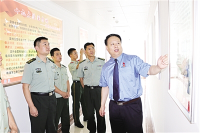 衡水市冀州区检察院在“八一”建军节之际与驻冀部队官兵开展了“庆‘八一’ 重温古田会议精神座谈联谊会”,进一步增进军检友谊,弘扬优良的革命传统和爱国主义精神。图为衡水市检察院党组成员、冀州区检察院检察长刘伟在介绍该院检察文化长廊。 刘延岭 摄