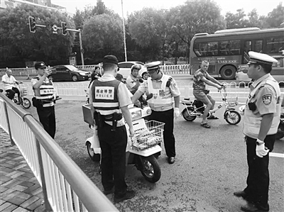 图为民警在查纠非机动车交通违法。
