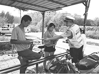 图为该大队民警在向群众发放交通安全宣传资料。 文/图 王晓刚