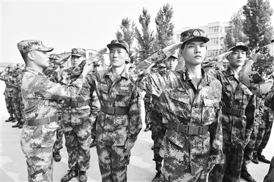 为了让应征青年入伍后尽快适应部队生活,新乐市武装部组织体检政考“双合格”的139名应征青年来到某训练基地,进行为期5天的思想政治、军事技能等役前教育训练,引导应征青年树立正确的国防观念,坚定参军的思想根基。图为8月27日,在新乐市某训练基地,即将入伍的应征青年正在进行役前军事训练。 贾敏杰 摄