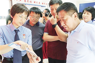 近日,衡水市冀州区人民检察院12309检察服务中心正式挂牌运行。该中心分为实体大厅和网络平台两个层面,集合了检察服务、检务公开等服务群众功能,涵盖国家赔偿、法律咨询等多个事项,打造检察机关为民服务新模式。图为工作人员向参观代表演示12309检察服务中心网络平台手机客户端应用情况。 刘延岭 摄