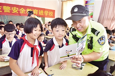 新学期开始,新乐市交警大队联合教育部门,在全市组织开展“交通安全知识进校园”活动。民警走进中小学校向学生们普及道路交通安全常识,增强学生安全出行的意识和能力。图为9月5日,该大队民警在西长寿小学为小学生讲解交通安全知识。