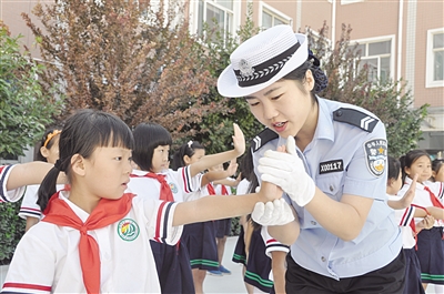 9月7日,南和交警走进县第一小学,开展交通安全宣传网络直播活动。宣教人员通过交通知识展板、交通指挥手势、趣味问答等方式,向学生们讲解了人行横道、交通标志标线、道路交通信号指示灯等交通知识,教育学生们要自觉遵守交通法规,从小养成文明交通的良好习惯。交警利用智能手机等,实时将上课宣讲、与学生们互动的情景呈现给广大网民。图为交警正在教学生们交通指挥手势。 范曙光 摄