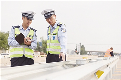 从事故黑点排查、交管设施改造,到信号灯合理配时、交通流量监测,唐山市公安交警支队各勤务大队的“路设员”每天巡查在路上,实地采集路况和交通动态信息,为引导勤务、完善设施、整改隐患、防控事故提供第一手材料,成为基层交管工作的一个“风向标”。图为10月8日,该支队二大队“路设员”在监督交管设施改造。 本报记者 刘文利 摄