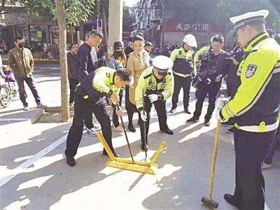 10月11日上午,省会裕华交警大队组织警力对非法安装在省会槐中路育才街南行150米路西道路停车泊位上的地锁和地桩进行拆除。行动前,民警对涉及商户进行了广泛宣传教育,并多次下达整改通知书,但一些商户仍不拆除。此次行动中,民警共拆除地锁22个、地桩13根,净化了道路停车环境,路过群众纷纷为交管部门的拆除行动点赞。 郭俊岭 朱晓明 摄