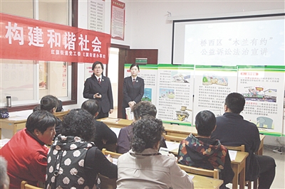 10月12日上午,石家庄市桥西区人民检察院牵头组织的“木兰有约”公益诉讼宣传活动走进辖区石风路社区,以检察机关公益诉讼工作为主题,为居民宣讲相关内容。活动中,检察干警利用展板,用通俗易懂的语言向社区居民介绍了检察机关公益诉讼工作。同时,引导社区居民关注身边事,对发现的公益诉讼线索进行举报。图为检察干警为居民宣讲公益诉讼相关知识。