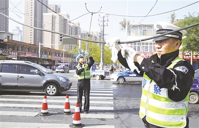 高举线缆清除路障 疏导车辆安全通行