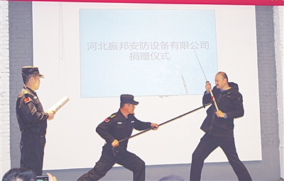 10月24日下午,石家庄市公安局裕华分局建华南派出所、石家庄市桥西外国语小学等10余家单位收到了河北振邦安防设备有限公司捐赠的价值数万元的防暴器材。此次捐赠的防暴器材,使用简单、携带方便,受到了受赠方代表们的一致欢迎。图为相关人员在演示防暴器材的使用方法。