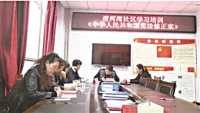 张家口经济开发区沈家屯镇清河湾社区将宪法学习宣传工作常态化、制度化,明确责任,认真落实,确保学习宣传工作有序进行,取得成效。图为该社区“两委”班子成员正在认真学习宪法。 刘佳文 摄