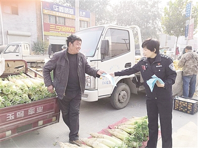 为树立交通安全意识,打造和谐交通环境,日前,省会交警通过各种方式积极开展交通安全宣传活动,他们走向街头,进市场、进饭店、进企业,向群众宣讲交通安全知识,结合案例普及交通法规。图为交警在农贸市场发放宣传材料,提醒群众摒弃交通陋习,时刻关注交通安全。 本报记者 张世杰 摄