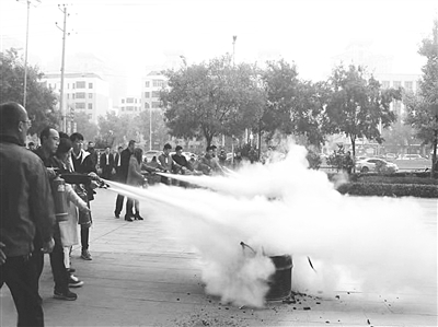 图为现场演练干粉灭火器灭火的场面。 本报记者 鲍娜军 摄