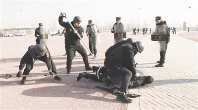 12月20日上午,唐山市路南公安分局、南湖公安分局、开滦公安分局、友谊公安分局联合开展应急处突实战演练活动。演练模拟犯罪分子持刀向群众砍杀的警情,民警迅速赶到现场,疏散群众,对犯罪分子进行抓捕。现场参演队伍整齐威严、斗志昂扬,展示了民警的良好精神风貌。 本报记者 刘文利 摄