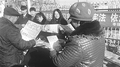 12月6日,枣强县人民检察院的干警赴该县王常乡南江官村开展“送宪法下乡”普法宣传活动。干警们通过悬挂条幅、发放宪法宣传资料、提供法律咨询等形式,推动宪法精神深入人心、落地生根。 石丽