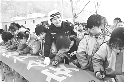 该大队宣传民警组织学生在“细节关乎生命,安全文明出行”宣传条幅上签名,并组织学生们宣誓,告别交通陋习,争做新时期交通文明的小小使者,掀起学生们学法、懂法、守法热潮,进一步提高了师生的交通安全意识和交通文明意识。