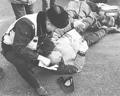 倒地受伤的是一名60多岁的老人。为了减轻他的痛苦,避免他的身体和头部受凉,于海超单腿跪在冰凉的地上,小心翼翼地托着老人的头部,用大腿支撑着他的身体,轻声呼唤他,不断询问着伤情。老人告诉于海超,他的头和肩膀疼得厉害,难以动弹。大约过了10分钟,120急救车到达事故现场,此时家属也匆匆赶来,将伤者送往了医院接受治疗。围观的群众将交警跪地助人的一幕拍了下来,将照片发到朋友圈,网友纷纷为“暖心交警”点赞。