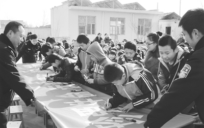 近日,北京铁路公安局神华公安处开展了“爱路护路保畅通、神华铁警在行动”冬季安全系列宣传活动,以提高沿线居民的爱路护路法治意识,营造浓厚的铁路爱路护路氛围。图为民警组织学生在横幅上签名。 纪凯 摄