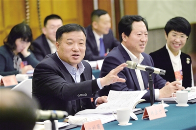河北省十三届人大二次会议期间,1月16日上午,在审议政府工作报告时,唐山代表团韩宏升代表(左一)就大力发展循环经济促进河北制造向河北创造转变提出建议。