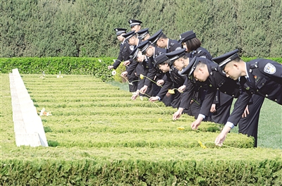 4月3日上午,河北出入境边防检查总站民警赴华北军区烈士陵园开展清明节祭扫活动,向烈士敬献花篮、瞻仰烈士纪念碑、参观烈士墓区,深切缅怀革命先烈丰功伟绩,弘扬革命先烈崇高精神。图为民警向烈士敬献鲜花。