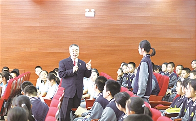 4月15日至4月19日,保定市两级检察机关同步开展了“送法进校周——法治副校长普法入校”活动,旨在深入落实最高检“一号检察建议”,履行好检察机关对未成年人法治教育职责和观护帮教职责,消除校园安全隐患,提高学生自我防护意识。图为4月18日,保定市检察院党组副书记、常务副检察长彭少勇以兼职法治副校长身份,在保定市第十七中学与同学们就相关法律问题进行互动交流。 赵健 王婧 摄