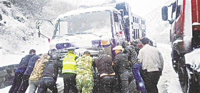 4月24日,乍暖还寒的围场满族蒙古族自治县突降暴雪,围场公安交警大队立即启动应急预案,全员上路执勤,疏堵保畅,成立多个应急机动小组,快速开展雪中事故处理和救援。目前,围场境内未发现较长拥堵路段,通行平稳。图为交警和群众一起救援雪中被困车辆。