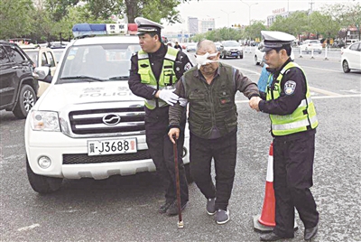 4月25日上午,在沧县医院门前,一名老人做白内障手术后来医院换药,因儿子去停车,只好自己往医院走。沧州市公安交警二大队两名交警赶紧把老人搀扶到门卫室等候。老人的儿子赶来后,向交警连声致谢。许多群众为交警点赞,并用手机记录下这暖心的一刻。 孙明山 摄