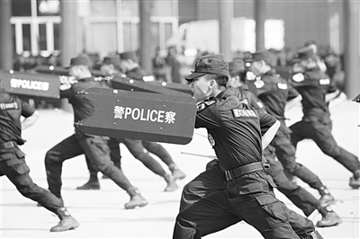 6月14日,在吴桥杂技大世界广场上,由沧州市公安特警支队牵头组织、吴桥县公安局具体承办的沧州市公安局“夏苗·2019”应急处突拉动演练正式拉开帷幕。沧州市公安局特警支队、巡警支队,吴桥、任丘、黄骅、海兴、孟村、盐山等公安局巡特警大队近千人参加活动。活动共设置8个单警种科目及多警种合成演练。此次演练旨在进一步提高警务合作效率,提升警务协作现场处置与合成作战水平。图为参战人员演练特警臂盾术。