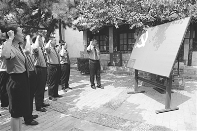 为纪念中国共产党成立98周年,邯郸市峰峰矿区人民检察院近日组织全院干警赴涉县129师司令部旧址,开展红色之行党日活动,激发干警从思想深处焕发爱党、爱国、爱人民的情怀。图为该院干警在重温入党誓词。 贾建科 摄