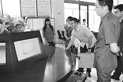 图为法官为华北电力大学法政系主任梁平一行介绍法院诉讼服务设施。