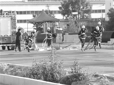 近日,任丘市消防大队开展了枪炮协同灭火操法训练,进一步提高了消防人员的灭火救援实战能力和整体素质,为圆满完成夏季灭火救援任务提供强有力的保障。图为训练现场。 李萌 摄