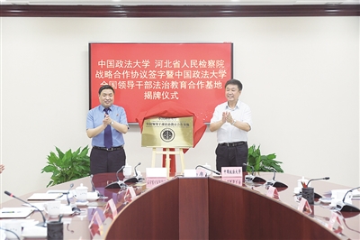 本报7月29日讯 (记者 刘树奇 孙继增 通讯员 尹孟良)今天,河北省人民检察院与中国政法大学在石家庄举行战略合作协议签字暨“中国政法大学全国领导干部法治教育合作基地”揭牌仪式。省检察院党组书记、检察长丁顺生,中国政法大学党委书记胡明出席签字仪式,并一同为合作基地揭牌。省检察院党组副书记、副检察长李玉龙主持仪式。中国政法大学副校长冯世勇,省检察院党组成员、副检察长高树勇在合作协议上签字。