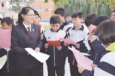 10月8日,广平县人民检察院检察官走进县第三中学,通过案例讲解的形式给孩子们上了一堂“如何预防性侵害”的特殊课程,并为孩子们发放了“守护童年,关注身体安全”宣传海报。图为检察官课后与同学们进行交流。