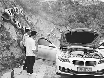 10月3日中午12时许,涉县交警大队应急小分队在圣福天路巡逻时,发现一辆白色轿车前机盖着火。由于事发现场位于景区,过往车辆及游客较多,情况非常紧急,民警们立即分组展开救援。一组向过往车辆借来灭火器灭火,另外一组隔离周边车辆,避免其他车辆受到波及。经过大家通力协作,火很快被扑灭。 本报记者 李建华 摄