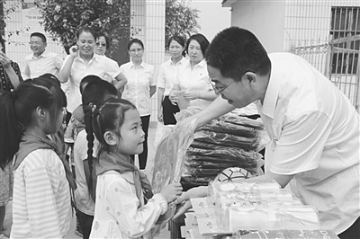 9月27日,赞皇县人民法院第一党支部党员在党组书记、院长王伟的带领下,来到院头镇河庄村小学,开展“送温暖进校园”党员志愿服务活动。图为王伟为孩子们分发文体用品。 陈文君 摄