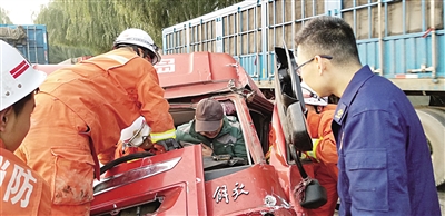 10月11日5时41分,阳原县化稍营镇高速收费站南一公里处发生一起交通事故,两辆半挂车发生追尾,一人被困,急需救援。接到报警后,张家口市消防救援支队指挥中心立即调派阳原县消防部门赶赴现场实施救援。尾车驾驶室已经被前车拖离车身,一名驾驶员被困车内无法动弹,情况十分危急。救援小组利用液压顶杆、液压扩张器对变形驾驶室进行破拆,扩大救援空间,最终将被困司机成功救出,并立刻移交现场交警、120医护人员处置。图为救援现场。