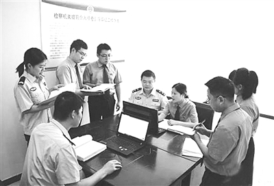 为确保法律监督有力有效,提高办案质量,日前,阜城县人民检察院派驻县公安局检察室挂牌成立,该检察室由该院第一检察部员额检察官轮流值班,承担立案监督、侦查活动监督及提前介入重大、疑难、复杂案件等职能,从源头上规范侦查活动,实现检察监督工作从事后监督到实时监督和全程监督的转变。图为检察官和民警一起讨论案件。 本报记者 张兰华 摄