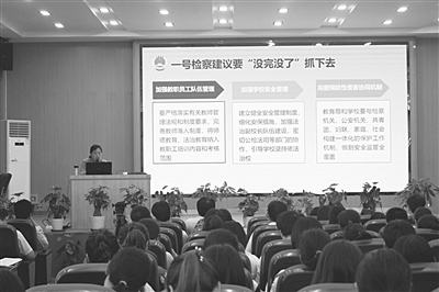 座谈会上,该院副检察长王瑛向与会人员详细介绍了“一号检察建议”的下发背景、内容、意义及最高检的相关部署,通报了该院近年来办理涉及性侵害未成年人刑事案件的相关情况,并针对教职人员性侵害学生这一问题,提出完善教师准入制度、严把教师师德关、禁止“狼师”入校园等具体建议。经济开发区社会事业发展局局长王俊梅介绍了该局落实“一号检察建议”的具体情况,深入剖析了校园管理机制方面存在的问题。座谈会上,与会人员还结合当前校园及校外附带机构性侵未成年人犯罪的现状,就部分寄宿制学校、托管机构、无资质辅导机构存在的安全隐患及整改措施进行了深入讨论,就如何落实“一号检察建议”、预防幼儿园儿童及中小学生遭受侵害进行了交流。