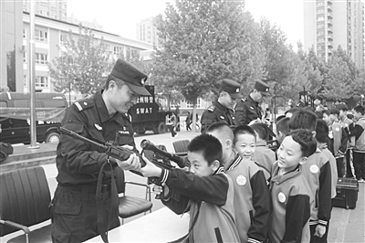 为庆祝中国少年先锋队建队70周年,进一步提升在校学生法治安全意识,近日,沧州市公安局特警支队民警分别走进该市第九中学、黄河路小学等共建单位,开展爱国主义教育活动,与学校师生零距离互动。他们通过悬挂横幅、发放宣传页、武器枪械展示、警犬捜爆演练、“我与国旗合个影”以及赴烈士陵园接受爱国教育等形式,进一步强化在校学生爱国思想和自我安全意识。 陈敩 摄