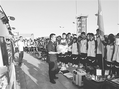 近日,盐山县消防救援大队开放消防站,迎来辖区100余名中学生,使学生们零距离感受和体验了消防文化,达到了“教育一个孩子、带动一个家庭、影响整个社会”的消防宣传目的,为人人关注消防、参与消防、支持消防奠定了基础。图为宣传人员为学生们介绍消防装备。 杨海明 摄