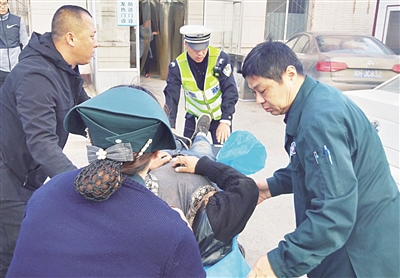 10月25日8时50分,沧州市公安交警二大队执勤交警驾驶警车巡逻时,一辆轿车从后面追了上来。司机向交警求助,称车上有急性脑梗病人,情况十分危急,需要到医院救治,可又不熟悉去医院的路。交警见状,迅速驾驶警车开道护送,不到5分钟便带领求助车辆到达就近的医院。图为交警协助将病人抬进急诊室。