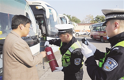 近期以来,沧州市公安交警二大队加大对客运车辆的源头监管力度,专门派出交警深入到辖区客运场站,进行客运车辆安全隐患排查,对客运车辆的消防设备、逃生锤、轮胎磨损及客运车辆安全技术状况进行认真检查,消除客运车辆安全事故隐患。同时,交警对驾驶人进行面对面的安全教育,提醒每个驾驶人自觉遵守各项法律法规和安全管理规定,随时对车辆进行检测,谨慎驾驶,文明行车,保障客车行车安全和乘客人身、财产安全。图为11月4日上午交警在沧州市北个体汽车站对客运车辆的消防设备进行安全检查。