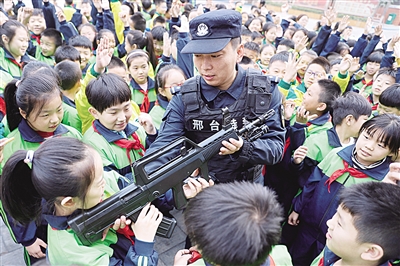 “真酷,这是我第一次见到狙击枪!”一场别开生面的警营开放活动,让小学生们过足了“特警瘾”。11月6日上午,邢台市公安特警支队二大队赴胜利小学,举行以“关注成长·关爱未来”为主题的警营开放活动。通过法治安全教育讲座、情景模拟互动和武器装备展示等形式,学生们对特警有了一定了解,树立了法治观念,提高了自我保护和安全防范意识。此次活动为进一步推动警、校共建打下了坚实基础。图为学生们近距离观摩、了解枪支。 陈璐 摄
