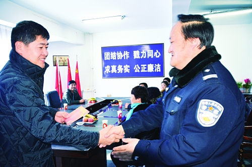 1月22日上午,承德市公安局党委委员、副局长赵兴海深入围场满族蒙古族自治县公安局进行春节前慰问。赵兴海分别向因公牺牲民警的家属、患重大疾病的民警、家庭生活困难的民警以及条件艰苦的派出所发放了慰问金,并对部分生活困难民警发放了食用品。图为赵兴海为民警发放慰问金。