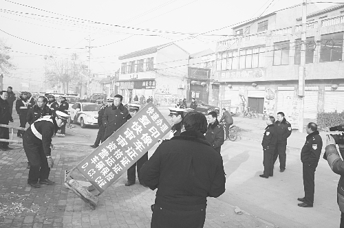 为维护良好的车管办公秩序,魏县交警大队联合治安大队、魏城镇派出所及工商、安监、城管等部门开展专项整治行动,取得了良好效果。图为1月17日,执法人员在拆除非法中介牌子。