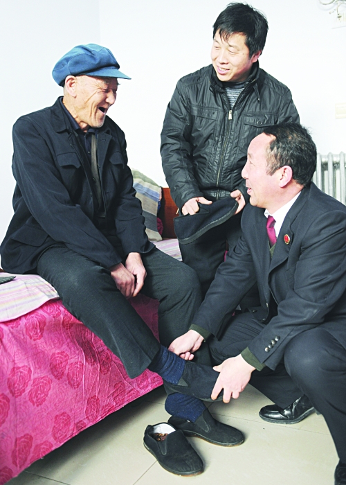 领导对结对帮扶的供养中心五保户老人穿上刚送去的新鞋